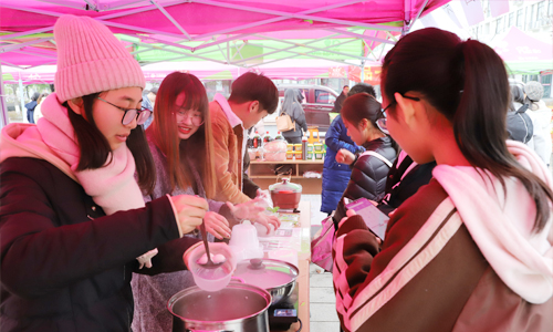 绍兴市丰收粮油有限公司、绍兴临山农产品有限公司等食堂大宗物资供应商的摊位前也极其热闹,他们凭借丰富的种类与价格的优势受到了师生们的青睐。绍兴同舟食品有限公司的鸡鸭副冻品也受到了大家的欢迎。“不少师生排队购买,我还雇了几个学生一起来帮忙。”同舟食品负责人说,2天来,他的收入已超过了2000元。活动现场,还有热乎乎的汤圆、糖画、糖葫芦等现做美食,供师生探寻舌尖上的年味。